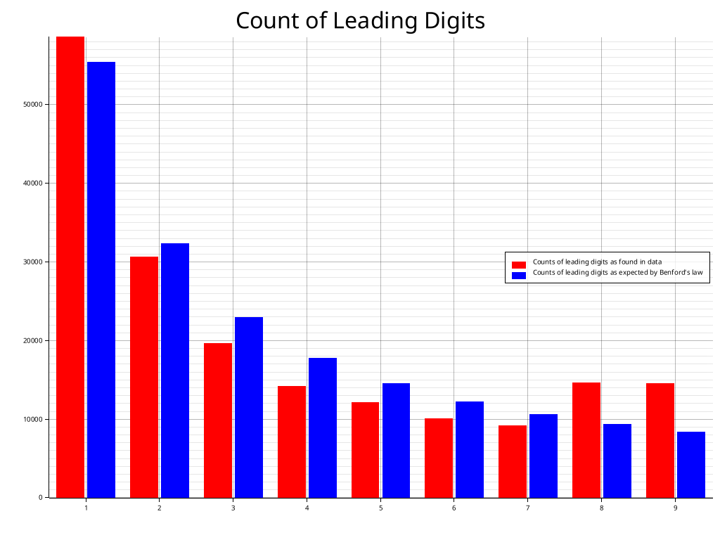 9 | 0.0795 | 0.0458Using a short Rust program utilizing the plotters crate the data as provided by the query is depicted in the following plot. As a comparison the expected number of leading digits according to Benford’s law as stated in formula (1) is provided by the blue bars.